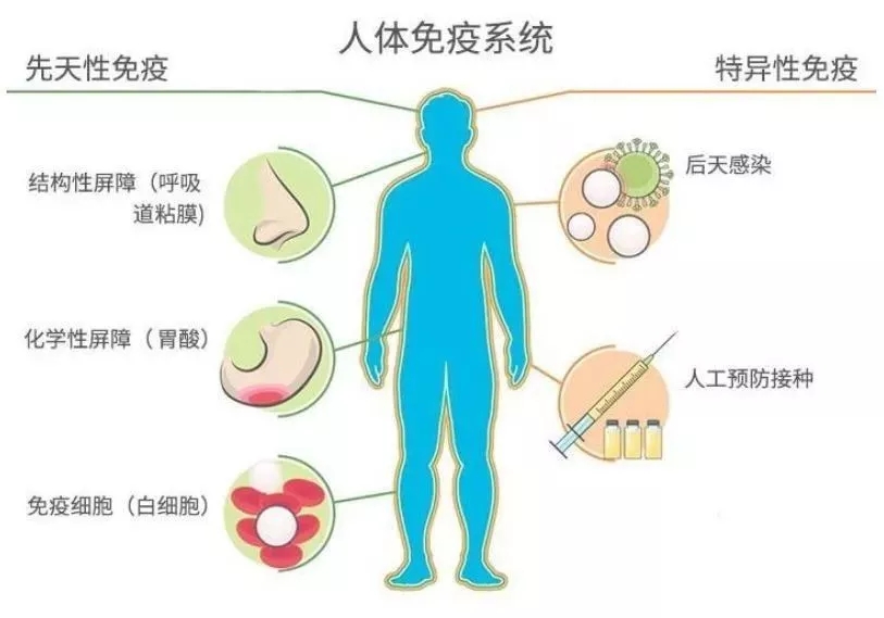 (二)适应性免疫(特异性免疫):后天获得,可通过注射疫苗、接触病原微生物、患过某种疾病而获得的某种特定免疫力,如:得过水痘的人不容易再得水痘、新生儿通过接种百白破疫苗预防疾病等。此种免疫可针对某特定的病原体迟发性应答,有特异性且作用强。构成人体免疫系统最后一道防线: