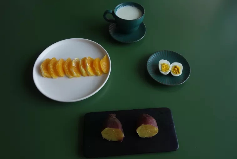 早餐时间不充裕,尽量简单操作,同时保持营养充足;鸡蛋含优质蛋白质,牛奶是钙和优质蛋白质的重要来源。橙子中维生素C含量高。而主食是甘薯,甘薯除了含淀粉提供能量外,富含膳食纤维,胡萝卜素,维生素以及钾、铁、铜、硒、钙等微量元素;甘薯有许多种类,口感也各不同,如福建的六鳌蜜薯偏甜,海南的板栗地瓜薯偏粉糯。