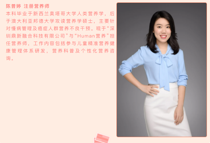 我是在国内本科就读期间发现了自己对营养学的兴趣,随后去新西兰的奥塔哥大学从头开始学预科和本科的人类营养学,毕业后去澳大利亚邦德大学继续深造营养学。回国后一直在企业从事儿童精准营养工作,主要面向2~6岁学龄前儿童。