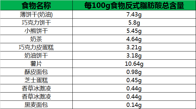 表:每100g食物中反式脂肪酸总含量