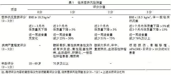 推荐采用临床营养风险筛查[2]方法对所有患者进行营养筛查(表1)。现对部分项目进行说明,以方便医务人员快速掌握筛查方法,进行准确划分。建议“疾病严重程度评分”,轻型或普通型患者评为1分,重症患者评为2分,危重症患者评为3分。另外,因该病的病程较短,较难出现体质量快速下降,因此“营养状况受损评分”中进食减少程度、BMI<18.5 kg/m2以及年龄 ≥ 70岁成为营养风险的主要因素。最终筛查的总分 ≥ 3分即认为有营养风险,应尽早制定营养支持计划。对于筛查总分<3分的患者则可一周后复查。对于营养筛查结果不清楚的患者,还可以进行更详细的营养评定,以确定患者的营养状况。
