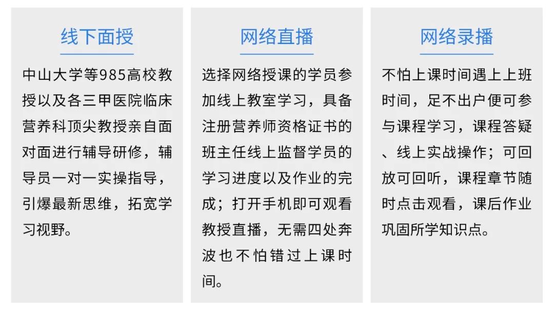 本地学员可现场面授,外地学员可通过直播、录播等形式进行授课,随时随地可点击课程视频进行学习;定期通过社群方式推送营养学相关资讯、考试信息、学习资料