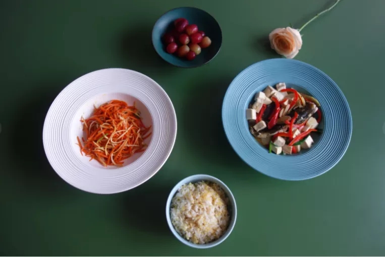 蔬菜:胡萝卜丝炒杏鲍菇,胡萝卜富含胡萝卜素,杏鲍菇属于菌类,可以提高人体免疫功能;豆腐鱼汤的颜色上较淡,用胡萝卜的橙色,增强视觉效果,刺激食欲。